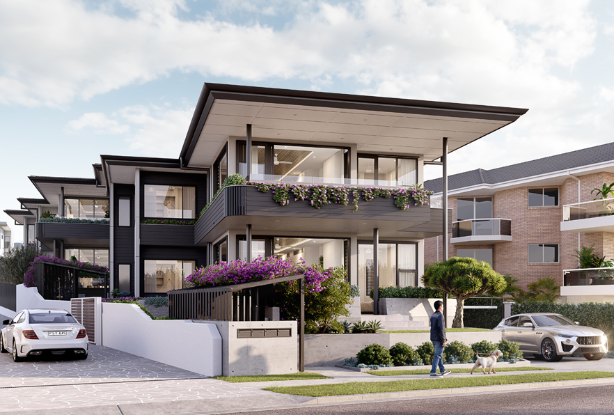 The project at 117 The Esplanade, Ettalong Beach, is a boutique beachfront development featuring four luxury penthouse-style apartments across two levels, with secure basement parking.